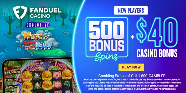 21+ and present in NJ, PA, WV or MI. $10 first deposit req. Bonus issued as non-withdrawable Bonus Spins that expire 5 days after receipt and are non-withdrawable. Casino site credit expires 7 days after receipt. Bonus Spins are received in increments of 50 and may only be used in the state of first deposit and on select games. Restrictions apply. See terms and eligible games at fanduel.com/casino.