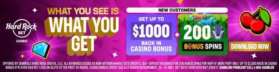 NJ and MI Only. Offered by Seminole Hard Rock Digital, LLC. All Rewards issued as non-withdrawable site credits. $10+ deposit required for 200 Bonus Spins for Huff N’ More Puff only. Up to $1,000 back in casino bonus if player has net loss on slots after first 24 hours. Casino Bonus credit has a 1x wager requirement. Bet with your head not over it.